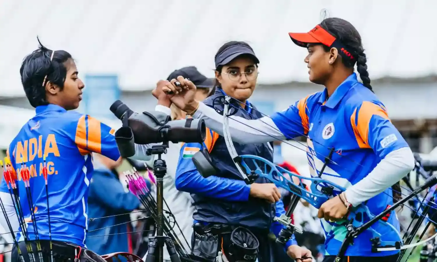 FILE PHOTO: Aditi Swami, Parneet Kaur and Jyothi Surekha Vennam (from left to right) won India's first ever gold medal at World Archery Championships. (World Archery)