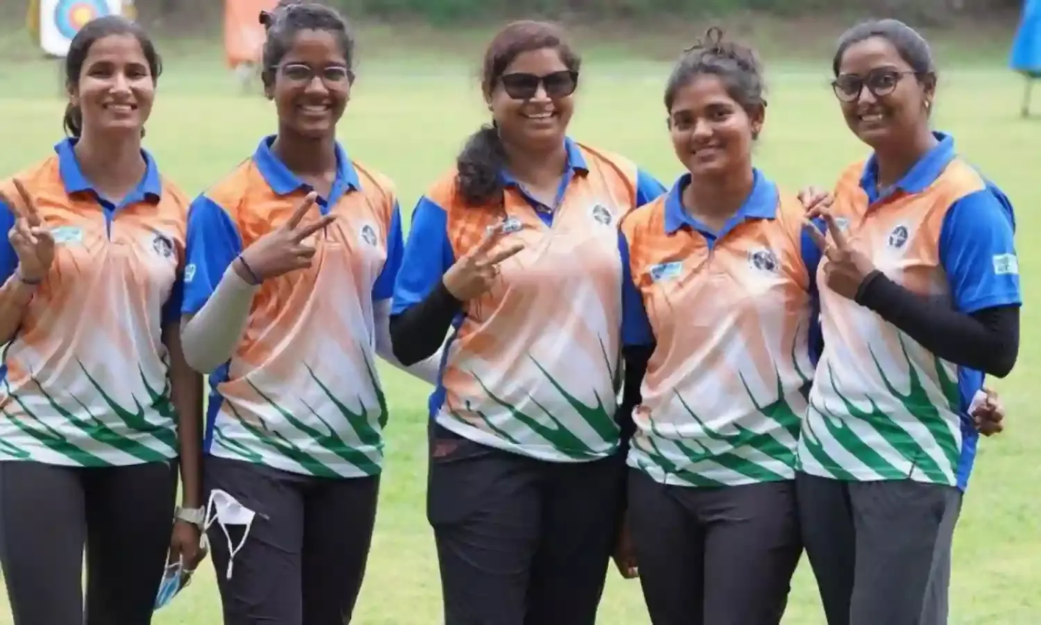 Indian recurve archery women team with coach Purnima Mahato in Paris