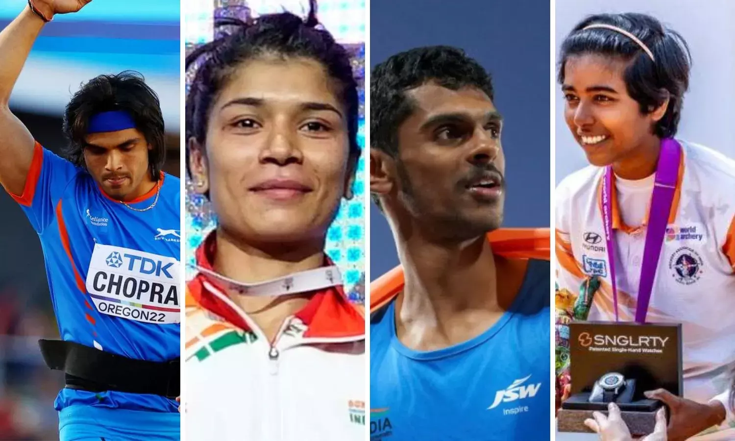 Left to right: Neeraj Chopra, Nikhat Zareen, Murali Sreeshankar and Aditi Swami.