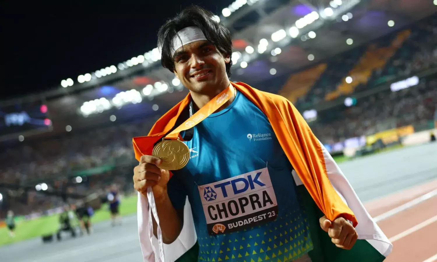 FILE PHOTO: Reigning Olympic champion Neeraj Chopra displays his gold medal at the World Athletics Championships in Budapest on August 28, 2023.