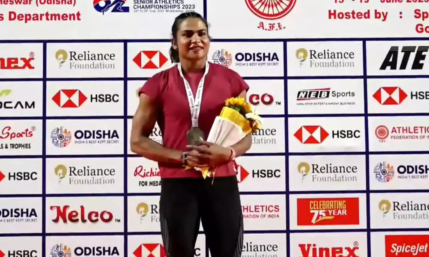 Anjali Devi with her gold medal at Inter-State National Athletics Championships. (source: AFI)