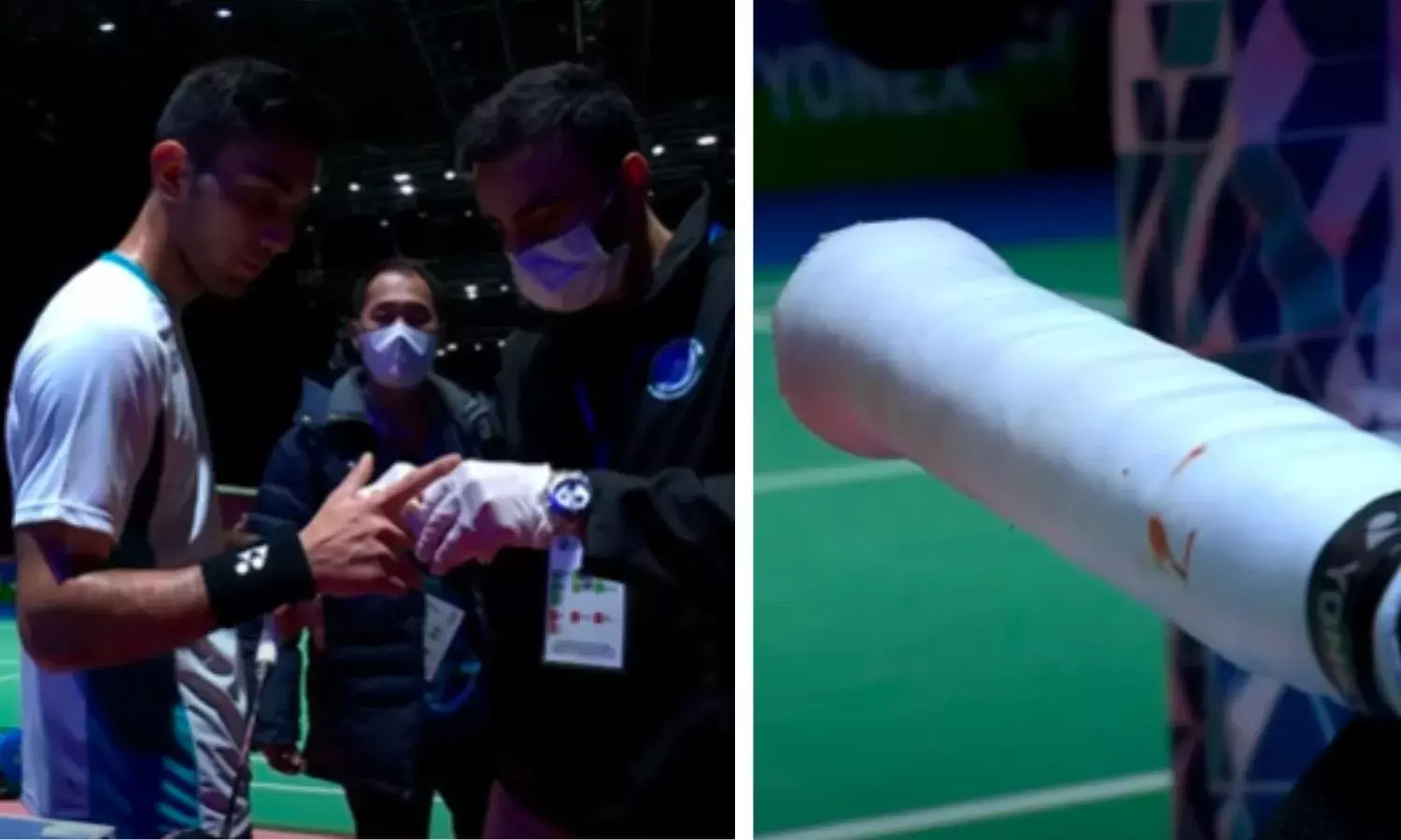 In another deja-vu moment right after Lakshya Sen won the opening game, 21-16, he went off-court to get some treatment on his hand, heavily taped again. A finger bruise had acted up this time, leading to some blood spilling on the court, staining Lakshya's white shirt as well his racquet grip.