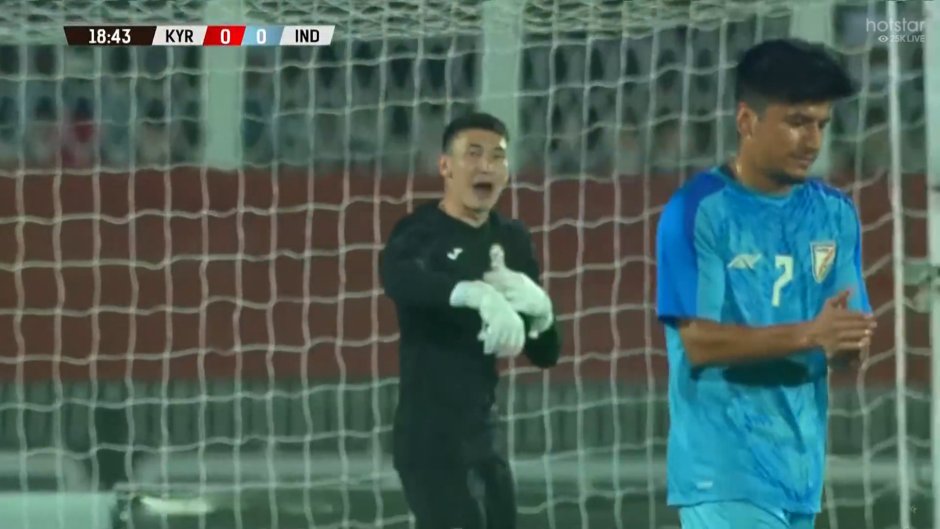Goalie Erzhan punches Brandon's effort away which was goal-bound, but very in the centre.