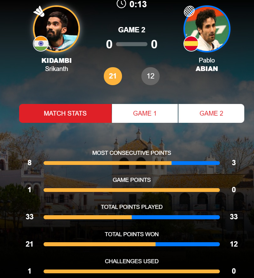 Srikanth wins the first game 21-12. The home player made a comeback to get within 4 points of Srikanth, who then pulled away to seal the first game convincingly.