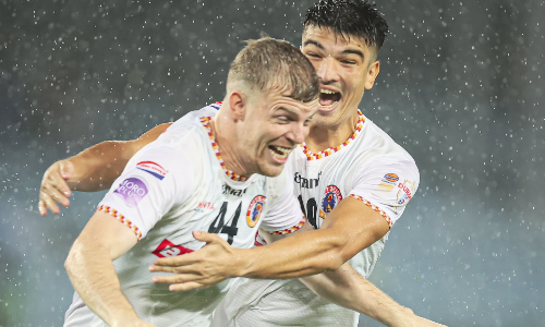 The ball is rolling at the KBK, Kolkata. Gokulam Kerala are playing from left to right.