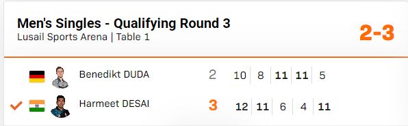 Harmeet Desai wins against top seeded World no.43 Benedikt Duda of Germany at qualifying round of WTT star Contender, Doha to book his spot in the main draw.