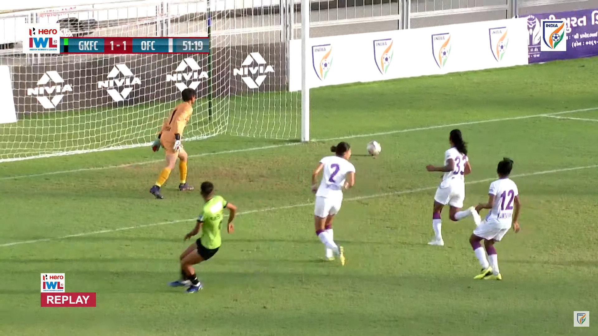 Sabitra Bhandari did well to go past a host of white shirts but her shot was awry and way off target.