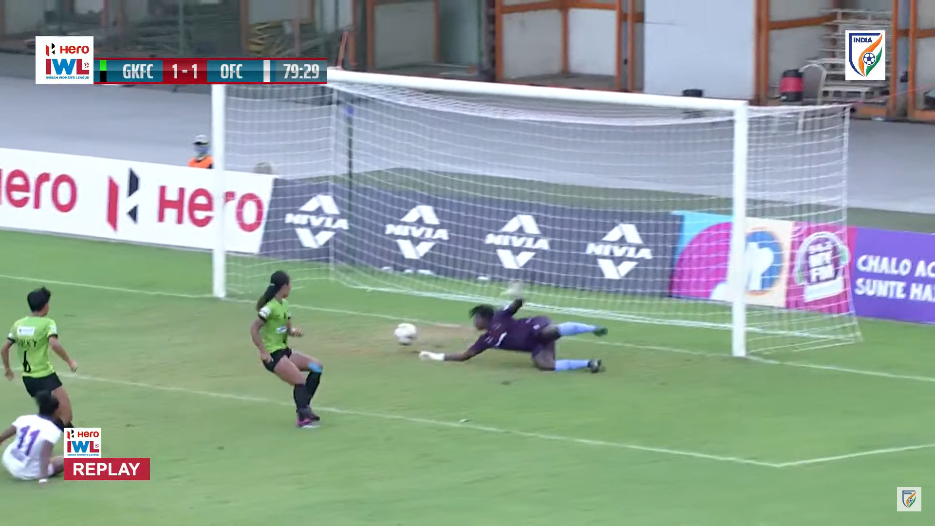 Substitute Pyari Xaxa received the ball from Cynthia inside the box and went for the goal but Gokulam goalie Beatrice stretched and pulled off a fingertip save!