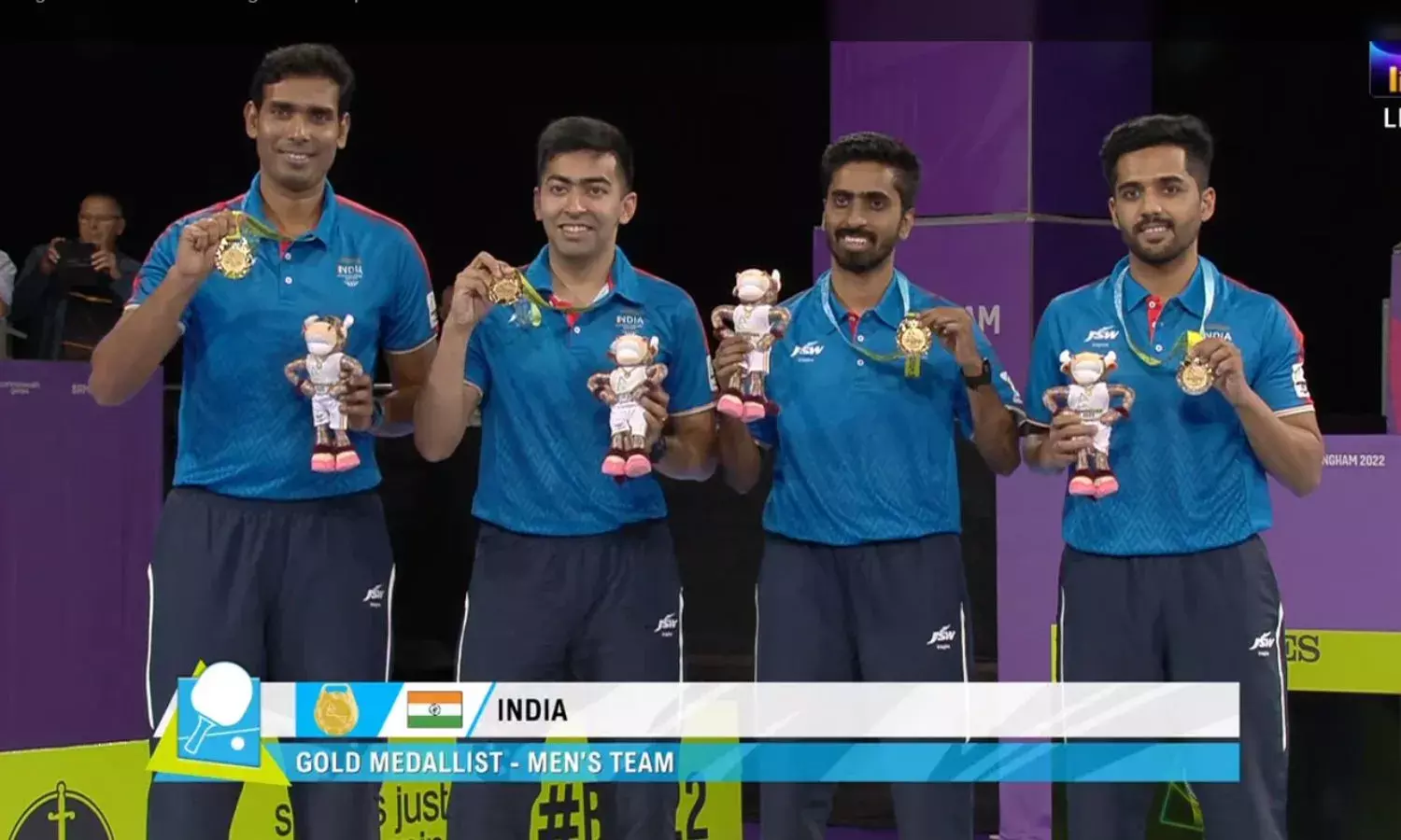 The Indian men's table tennis team, on Tuesday, clinched the gold medal in the team event at the Commonwealth Games. The Indian team comprising of Achanta Sharath Kamal, Sathiyan Gnanasekaran, Harmeet Desai and Sanil Shetty beat Singapore 3-1 to be crowned the champion.