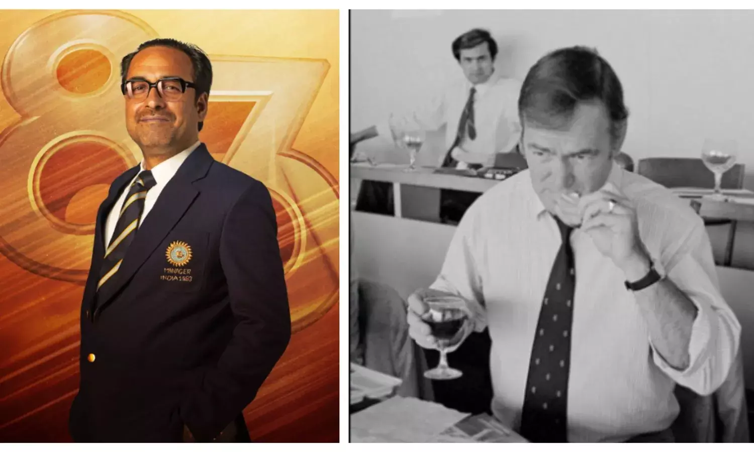 Indian team manager Man Singh (played by Pankaj Tripathi) is seen sending a letter to David Frith (right) after India's win in 83