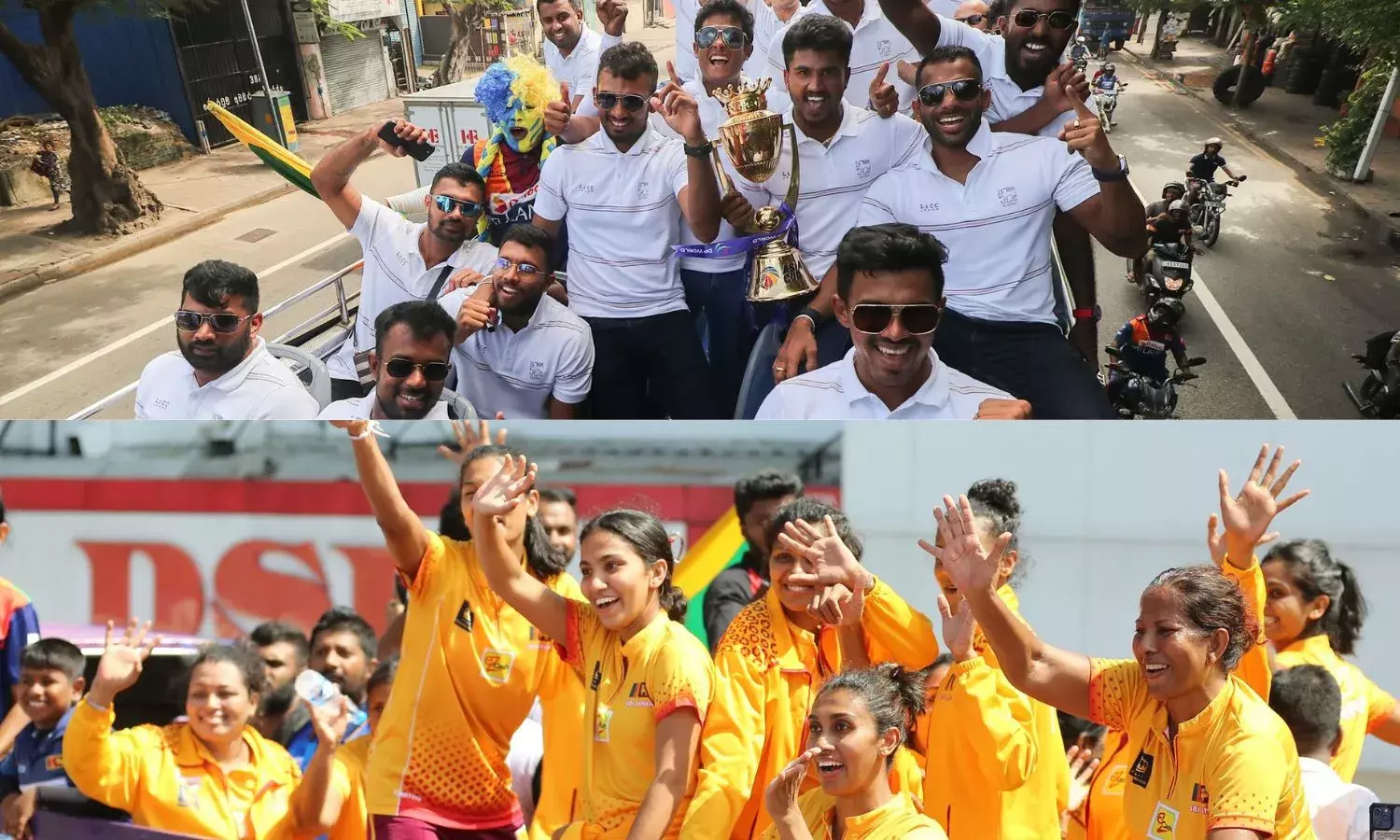 Sri Lanka Cricket team (above) and Sri Lanka Netball team (below) on the victory parade in Colombo. (Source: Twitter/ Sri Lanka Cricket)