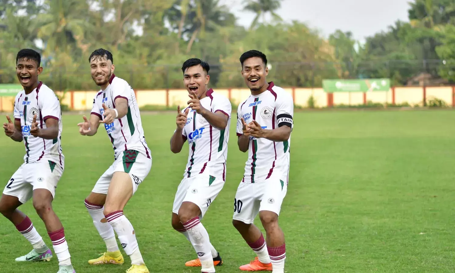 Mohun Bagan youth team players celebrating their win over East Bengal in the Reliance Foundation Development League in Barrackpore on March 18, 2023.