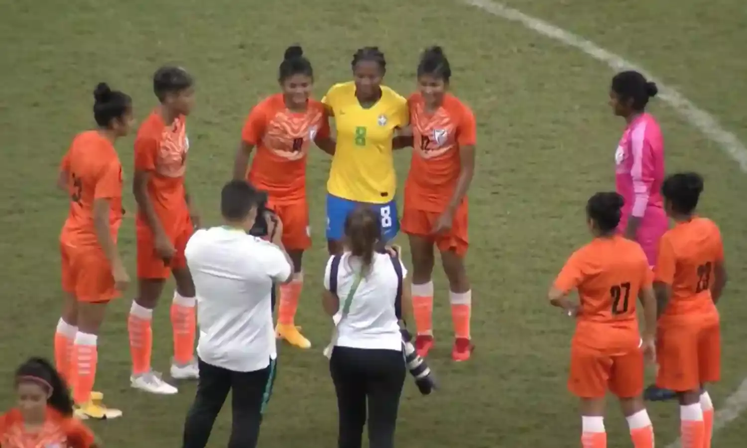 The Indian women's team with Brazilian legend Formiga at the end of the match (Screenshot)