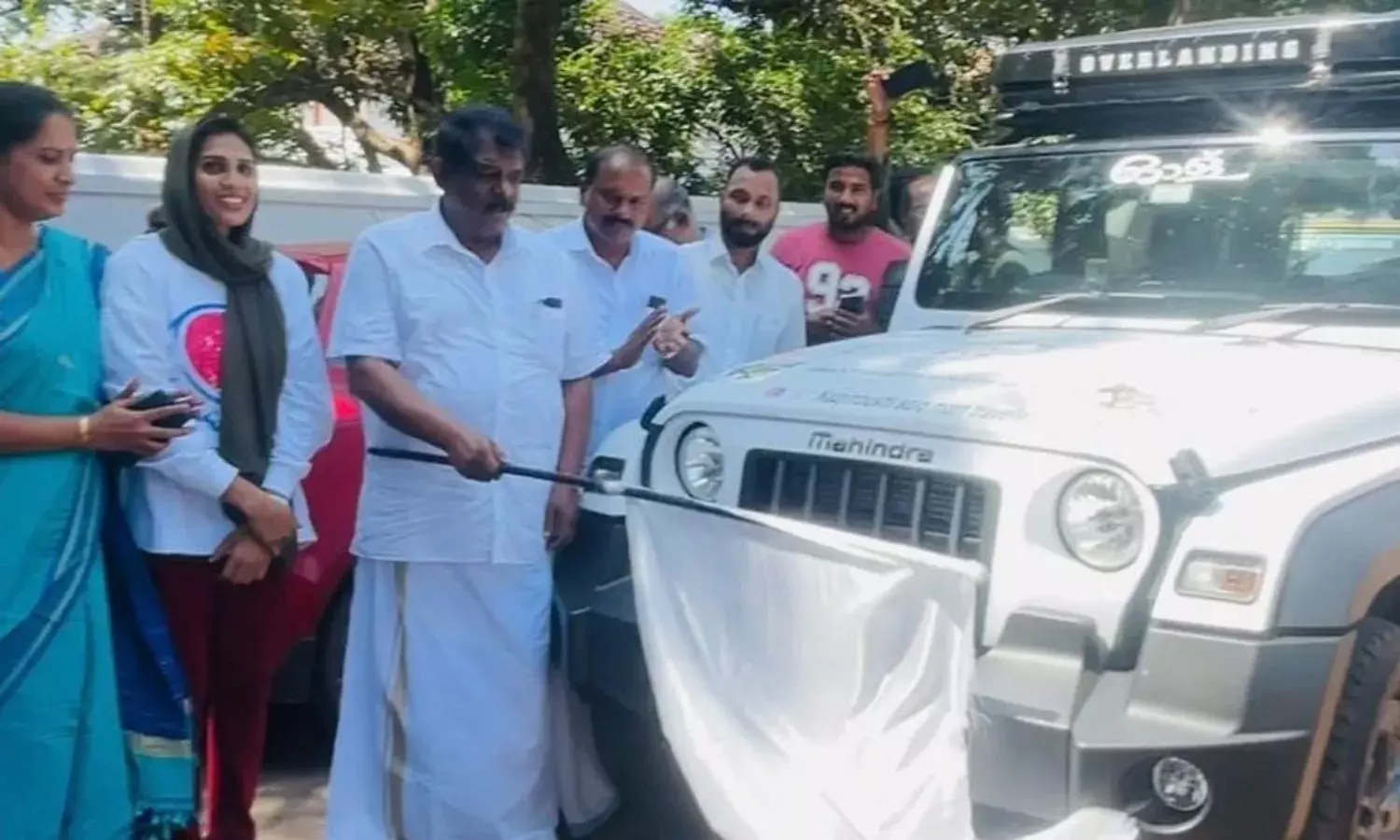 Naaji Noushi (second from left) begins her trip to Qatar in her car. (Source: Manorama Online)