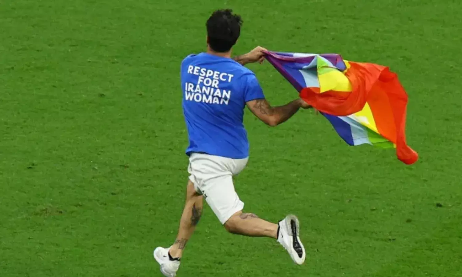 A protester ran onto the field carrying a rainbow flag and wearing a blue Superman T-shirt that said "SAVE UKRAINE" on the front and "RESPECT FOR IRANIAN WOMAN" on the back.