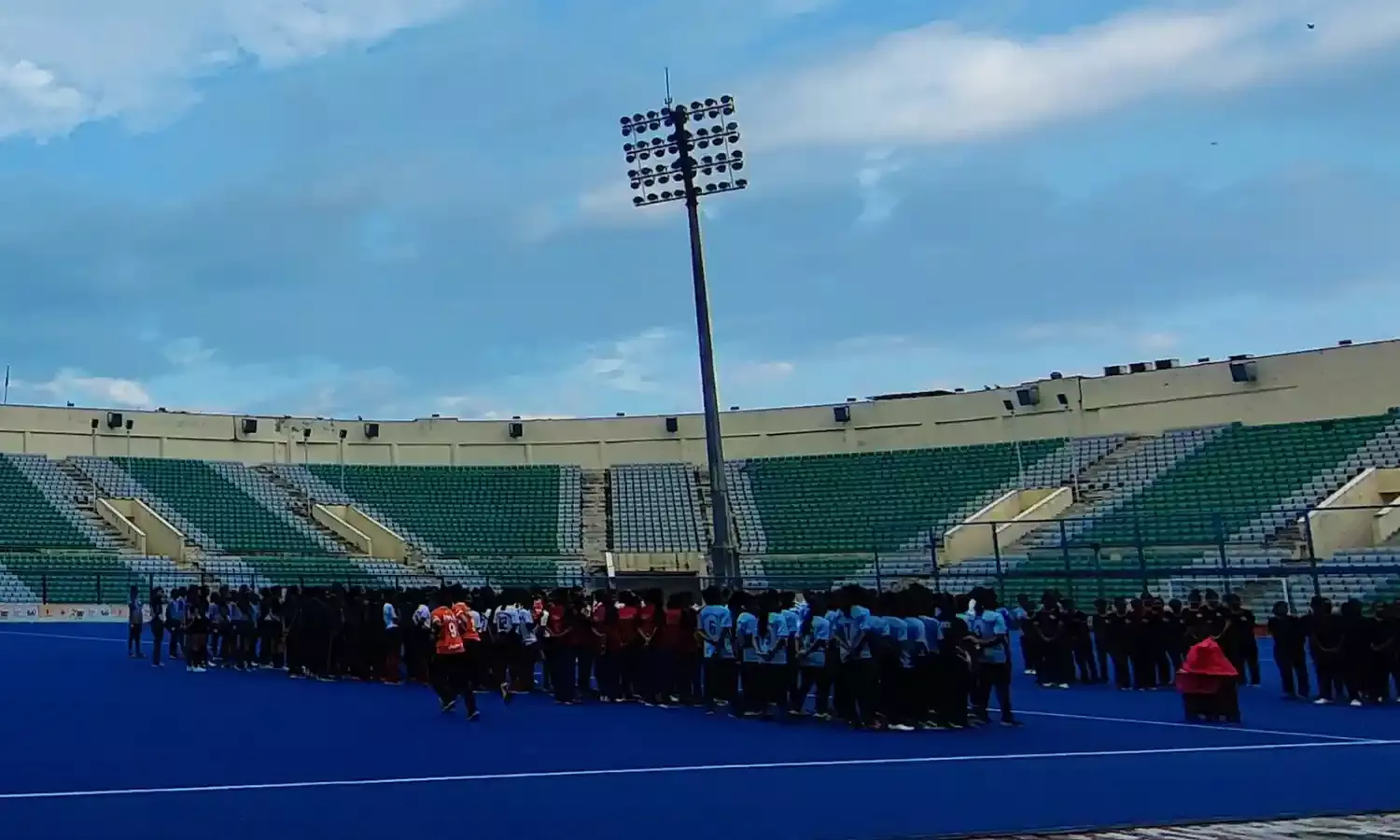 Girls lining up for a U-16 Khelo India Hockey game at Major Dhyan Chand National Stadium, Delhi. (PritishRaj/TheBridge)