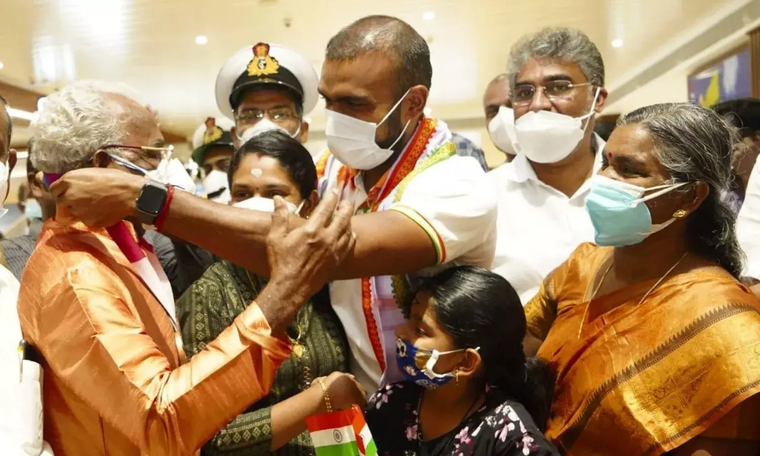 The family of Sreejesh, including his parents, P V Raveendran and Ushakumari, wife P K Aneeshya and children Anushree and Sreeansh were also present to welcome him home. In an emotional moment, Sreejesh put the medal around his father's neck. Later, he was taken to his residence at Kizhakkambalam in an open jeep accompanied by the minister.