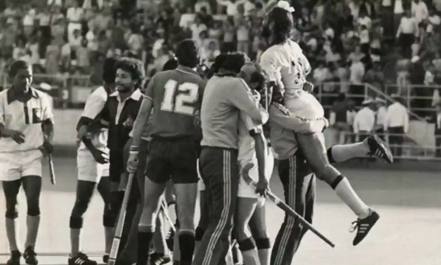 The Indian hockey players celebrate after winning the final against Spain to win the gold medal at the Moscow Olympics Games in 1980. (Source: Indian Olympic Association/Twitter)