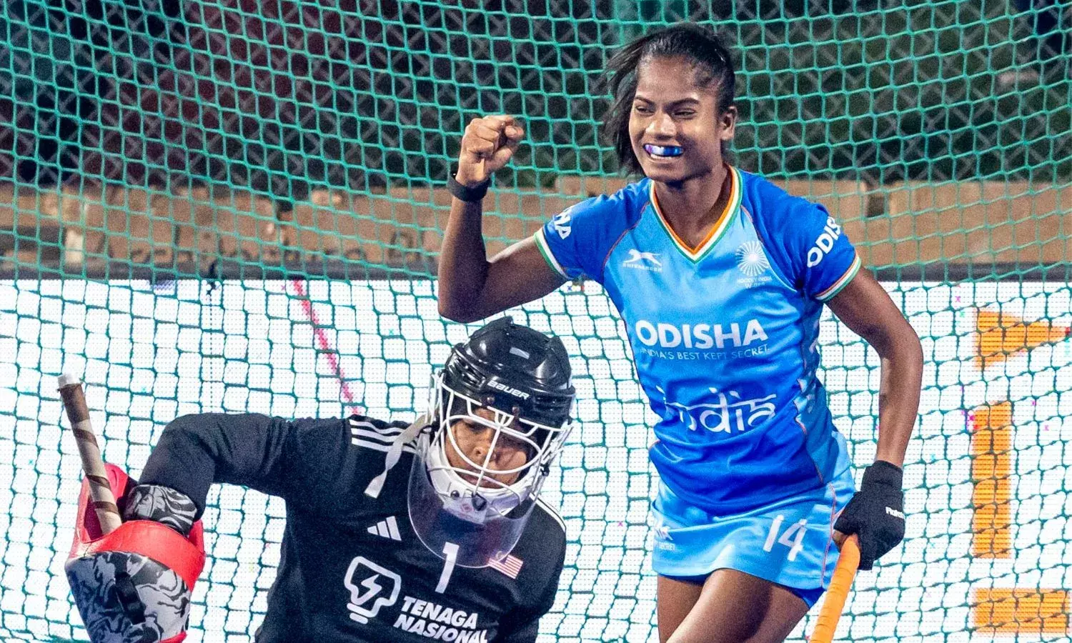 Sangita Kumari celebrates after scoring against Malaysia in the Women's Asian Champions Trophy 2024. (Photo Credits: Hockey India)
