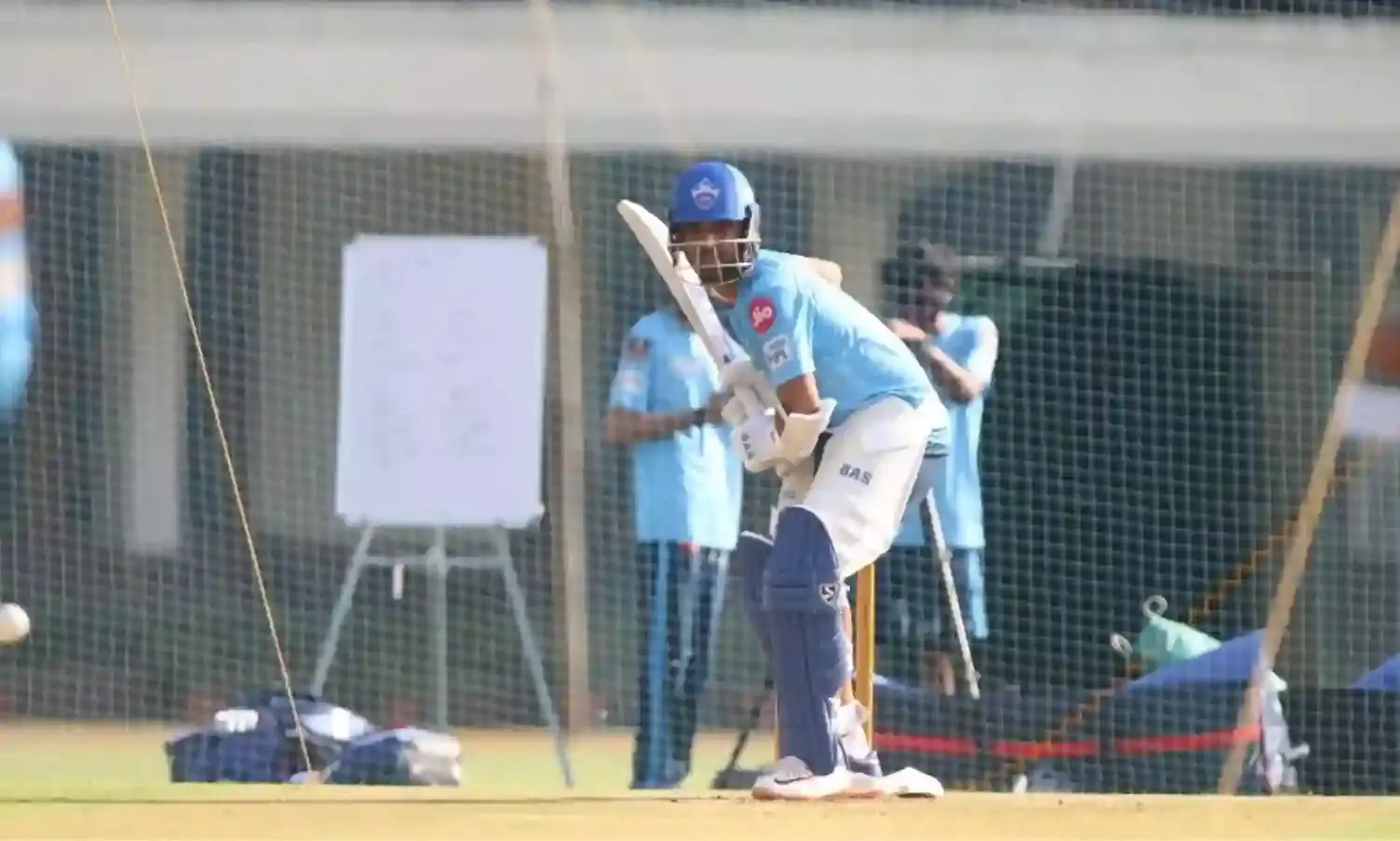 Delhi Capitals' Ajinkya Rahane during the net session. He was joined by fellow Indian teammates Ishant Sharma and Umesh Yadav. [Source: Delhi Capitals]
