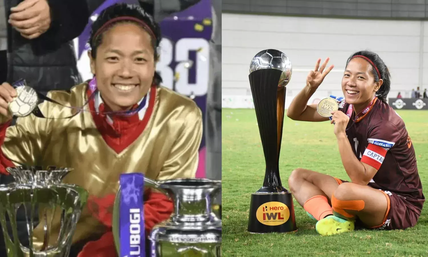 Dangmei Grace with her titles in Uzbekistan (left) and IWL trophy (right) (Source: AIFF)