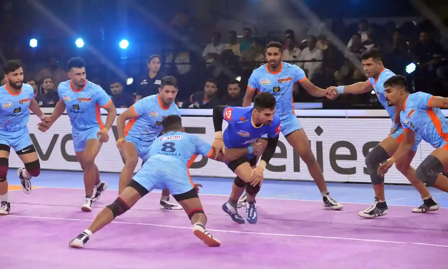 Trailing early on, Bengal Warriors showcased stunning defensive work with Girish Maruti Ernak impressing with his reflexive actions to get the very dangerous Meetu out twice in a row.