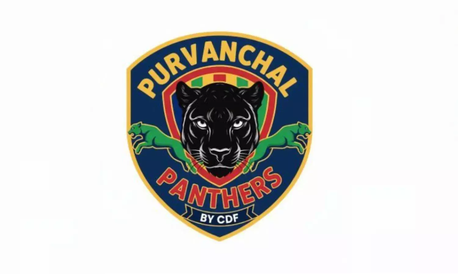 Purvanchal Panthers logo features a fierce panther flanked by two leaping cats symbolizing strength, precision, and unity.