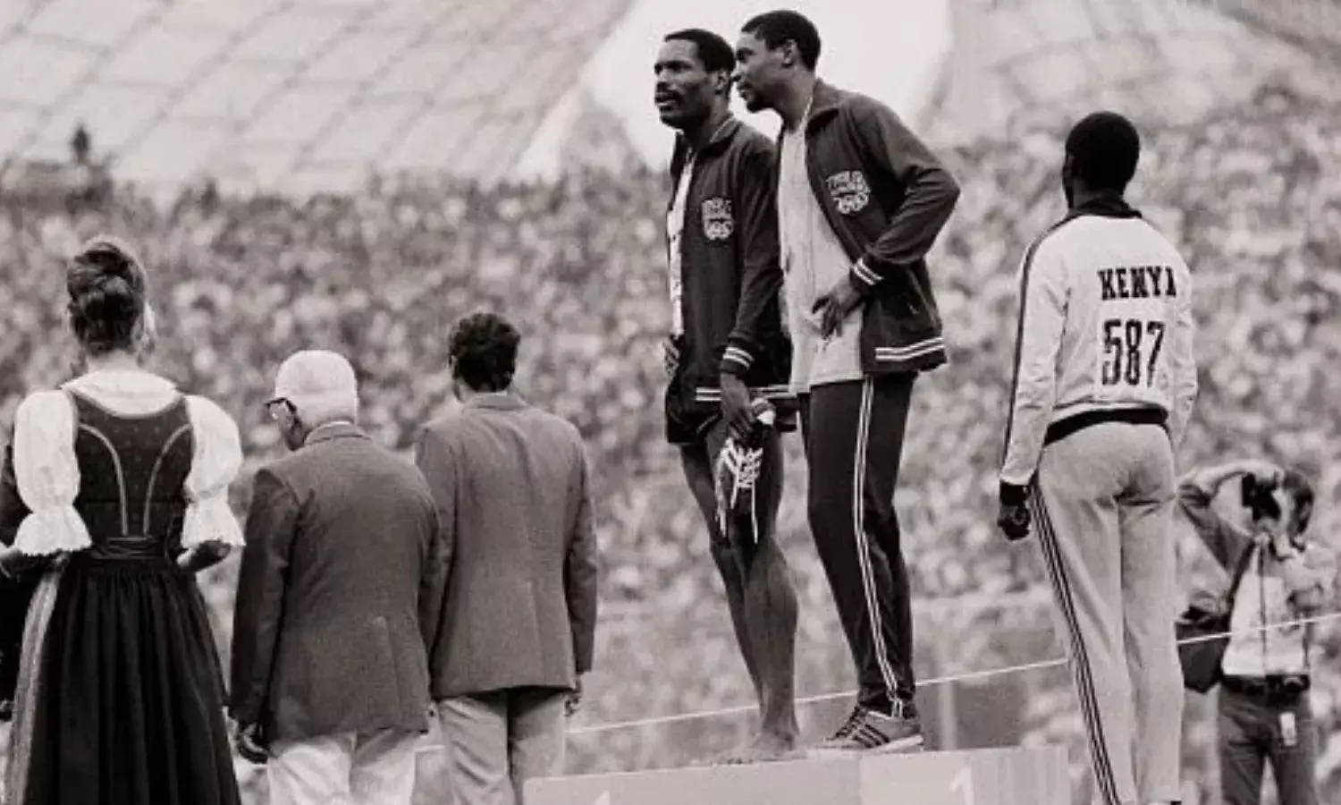The Americans Matthews and Wayne Collett, both Black men, finished 1-2 in the 400 meters in 1972. While the "Star-Spangled Banner" played during their medals ceremony, Collett stood with his hand on his hips. Matthews rubbed his goatee, crossed his arms and shifted his feet.