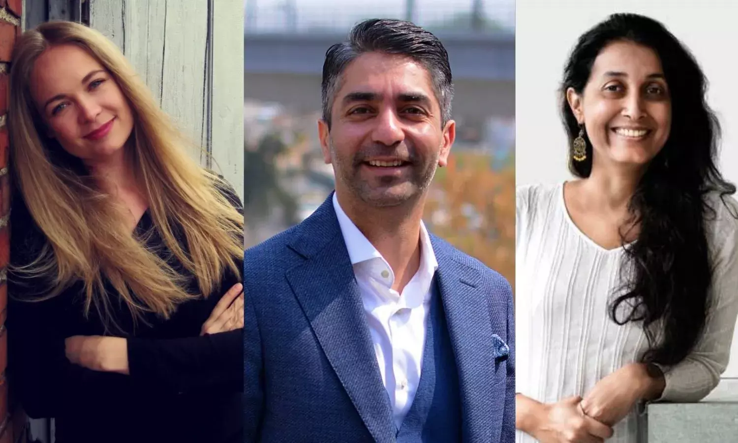 Panellists Xenia Kourgouzova (left-most) and Shaheen Mistri (right-most) with Abhinav Bindra