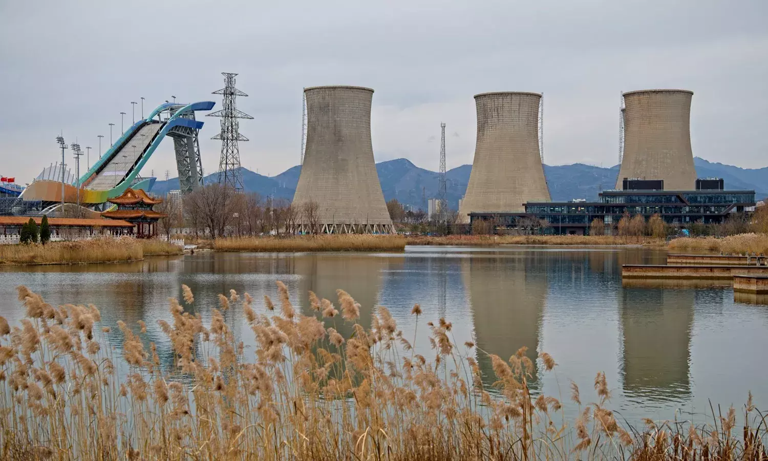 The ski jump platform at the 2022 Winter Olympics had a backdrop of old steel mills. (Getty)