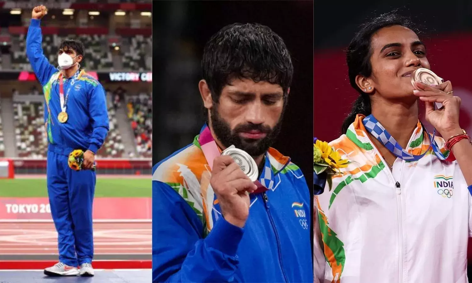 Athlete Neeraj Chopra with gold, wrestler Ravi Dahiya with his silver and shuttler PV Sindhu with her bronze medals at the Tokyo Olympics