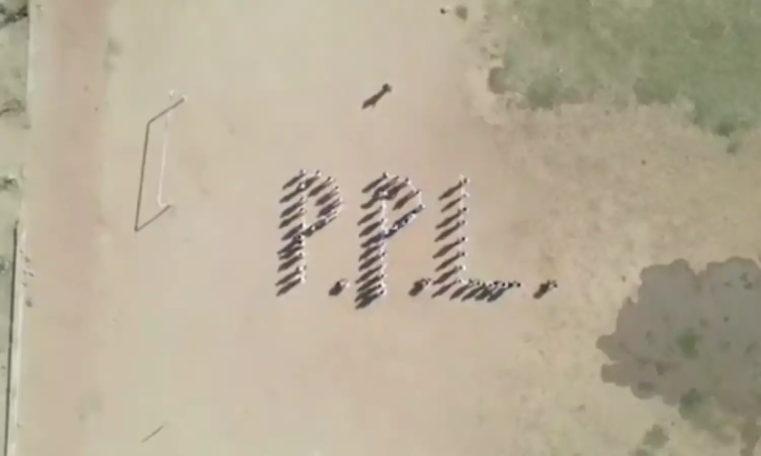Arm wrestlers at the Gwalior Arm Warriors Academy in Madhya Pradesh create a human formation of the Pro Panja League logo (Pro Panja)