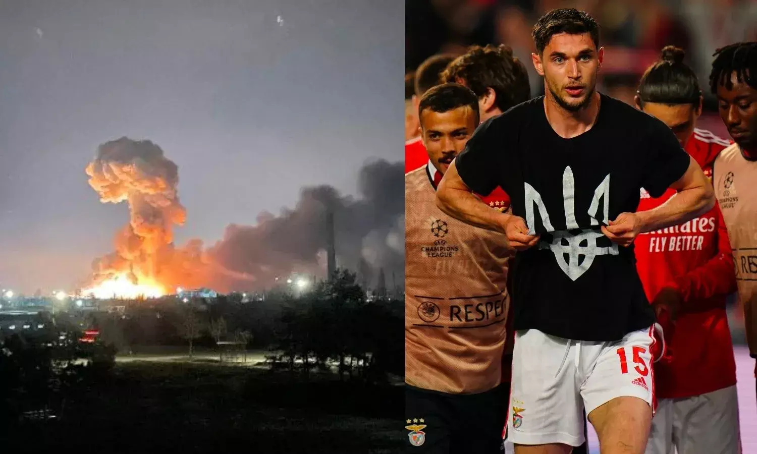 Explosions in Kyiv, Ukraine (left, Source: Twitter) and Ukrainian footballer, Roman Yaremchuk, unleashes emblem in support in a match