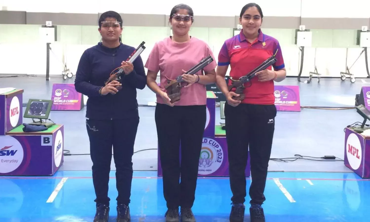 Asian Games gold medalist Palak Gulia (in middle) won the first day of 10m air pistol National shooting trials.