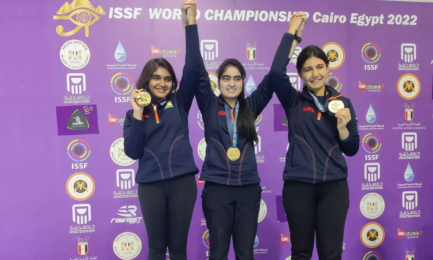 The Indian junior women's 10m air rifle team with their World Championships gold (Source: Esha Singh/Twitter)