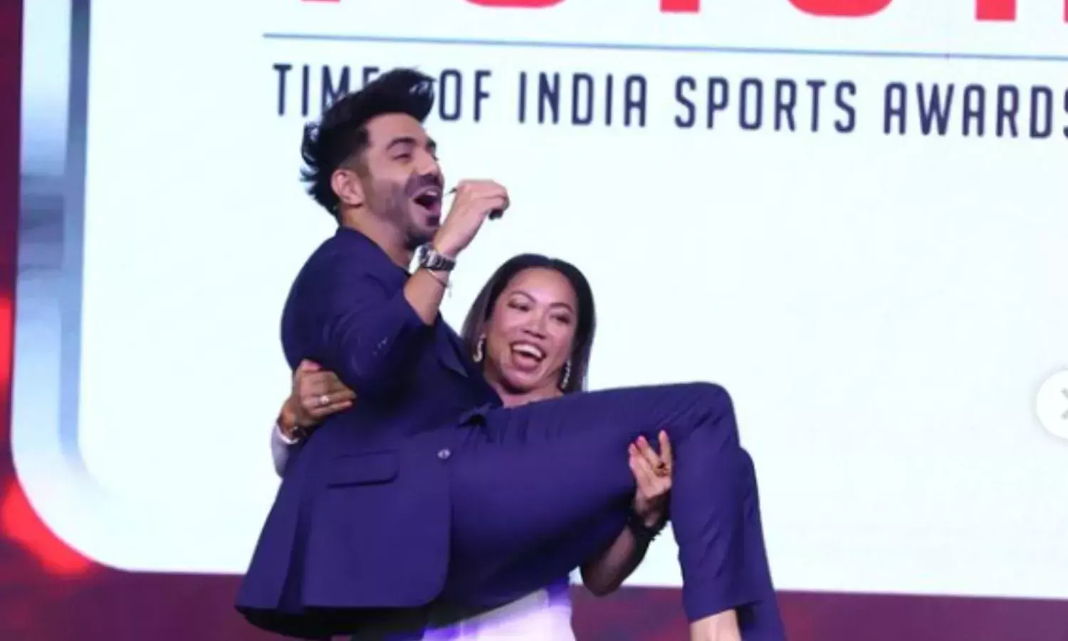 During the award ceremony Mirabai Chanu was seen indulging in some fun, lifting Bollywood actor Aparshakti Khurana like a bar of weight she lifts on a daily basis.