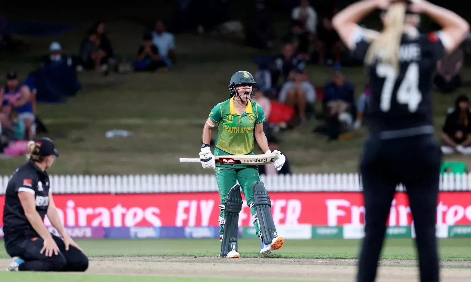 Marizanne Kapp celebrates after taking South Africa over the finish line against New Zealand (Source: cricketworldcup/Twitter)