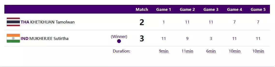 Sutirtha wins the fifth game 11-7 and clinches the match 3-1 against Tamolwan. This win gives India women a 2-1 lead over Thailand in their Round of 16 tie.