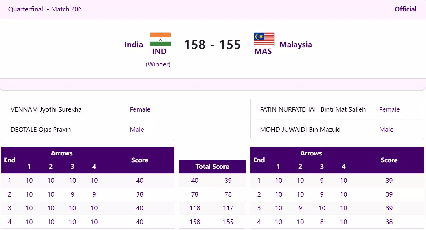 A good start for the Indian mixed team of Jyothi Surekha Vennam and Ojas Deotale defeats Malaysia 158-155 to move to the semi-finals of the mixed team.