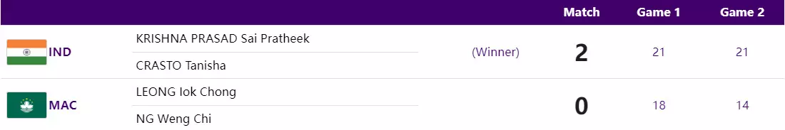 Indian Mixed double duo took an close two setter win (21-18, 21-14) over the pair from Macao and progress through to the Pre-Quarters.