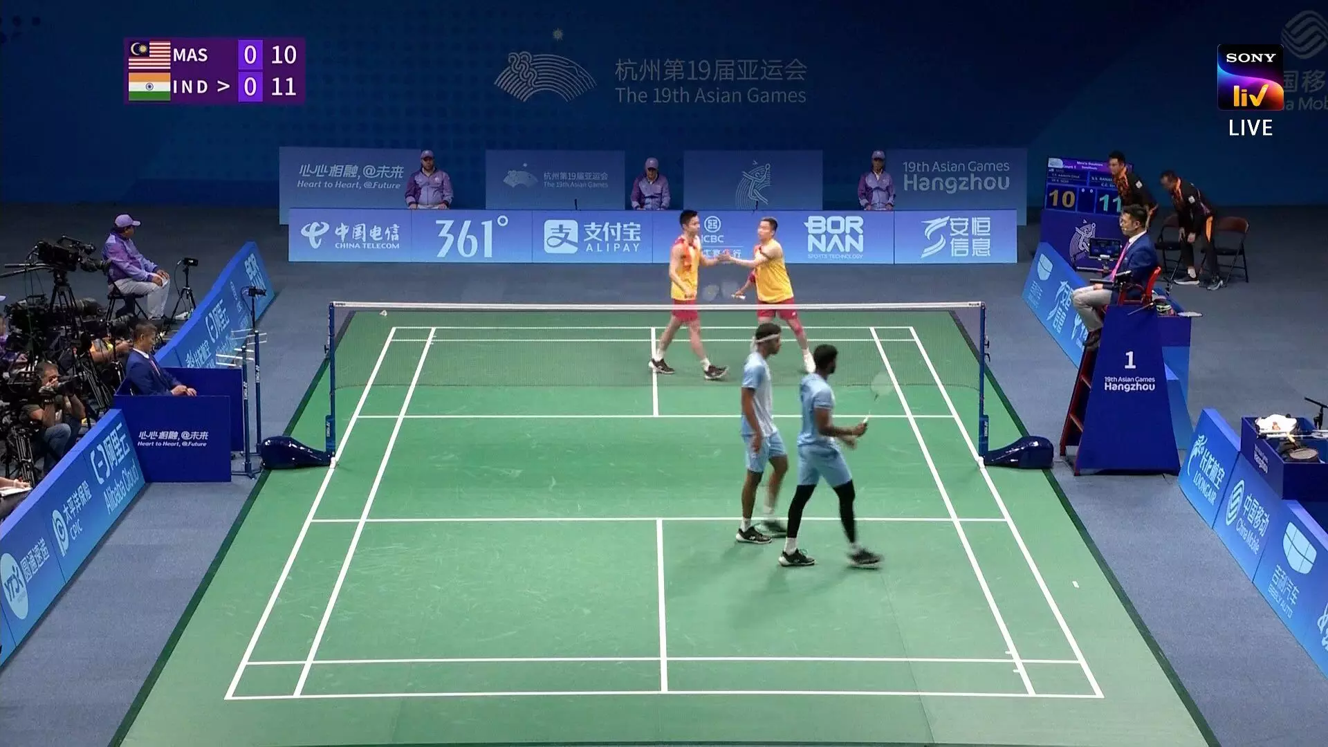 The Indians take an 11-10 lead at the interval. Satwik gets the space over the net and finishes it off with a smash.