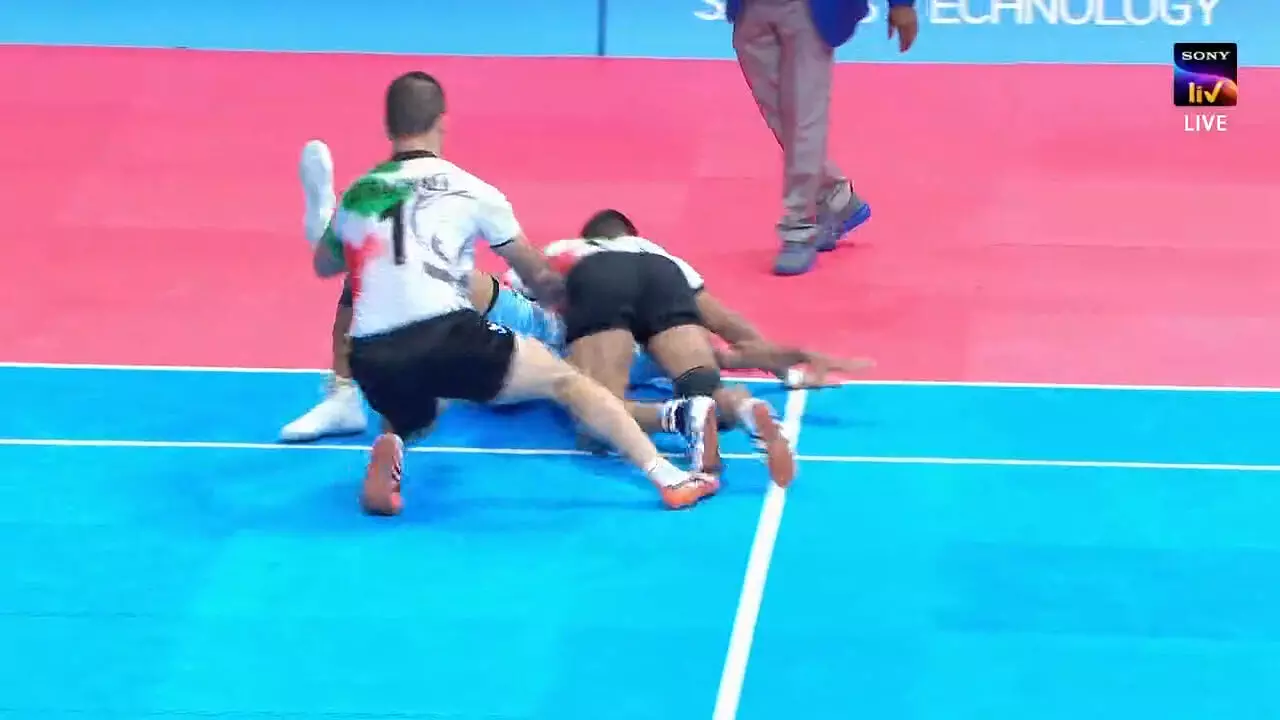 Fazel Atrachali is the only man left for Iran as Pawan takes the defender out and Iran is on the verge of an all-out.