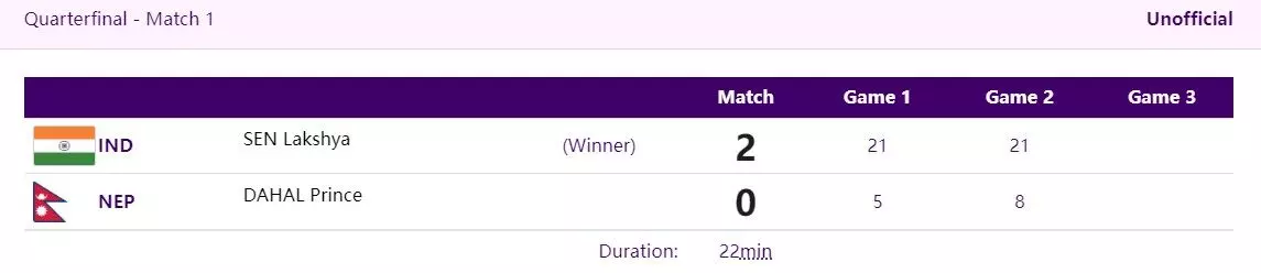 Final result: Lakshya Sen beats Prince Dahal 21-5, 21-8 in 22 minutes