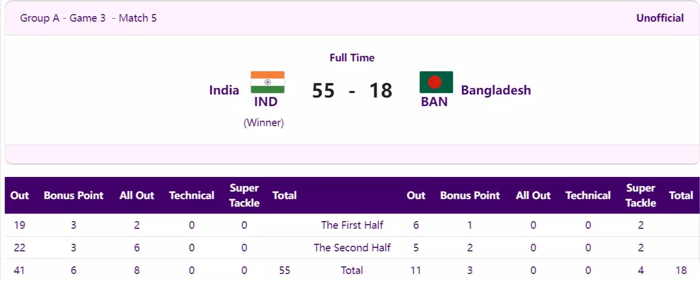 Comprehensive win for the Indian men's team as they defeat Bangladesh 55-18 and start with a resounding win.