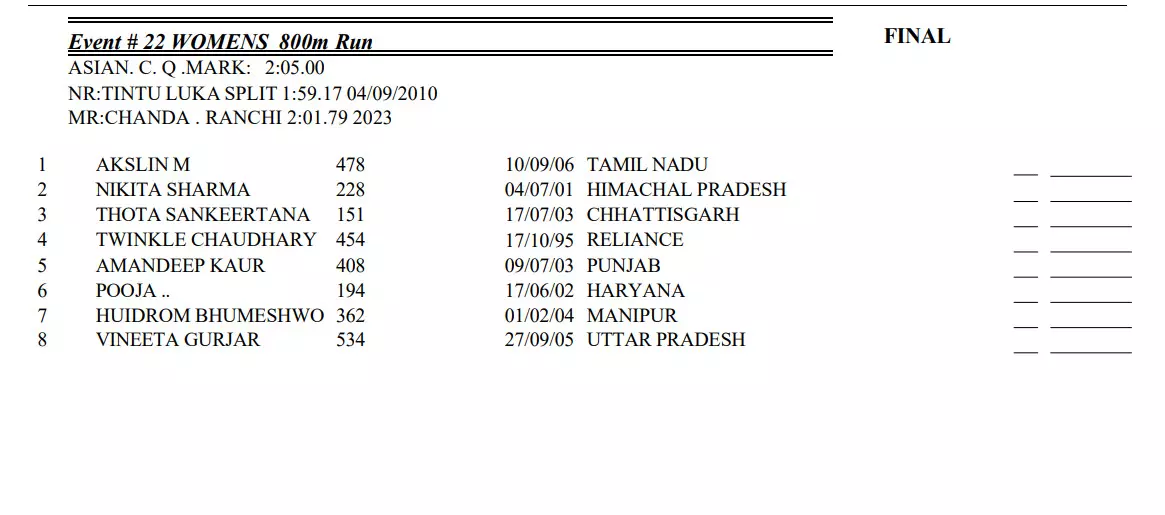 Twinkle Chaudhary emerged as the fastest women in the 800m heats. She clocked 2:05.20s to top the first heat, missing out on the 2025 Asian Athletics Championships qualification mark of 2:05.00s by a whisker.