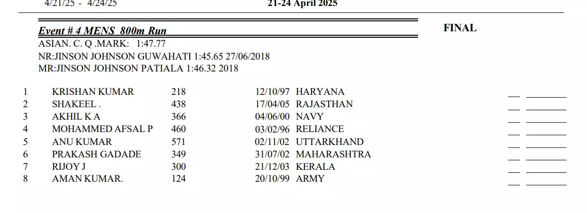 Afsal emerged as the fastest man in the heats, clocking 1:46.70s in the second heat. He breached the 2025 Asian Athletics C'ships qualification standard of 1:47.77s by a distance.