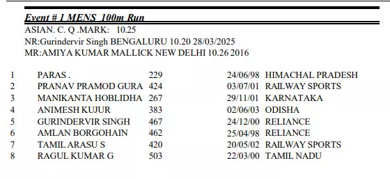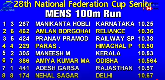 Semifinal 1: Karnataka’s Manikanta Hobildhar topped the first semifinal with a meet record time of 10.25s. The meet record was held by Amiya Kumar Mallick (10.26s) of New Delhi, who set it in 2016.