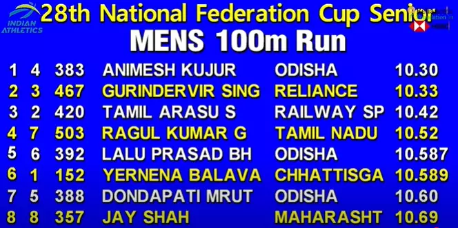 Semifinal 2: Odisha’s Animesh Kujur clocked 10.30s to finish ahead of national record holder Gurindervir Singh of Reliance, who crossed the finish line with a time of 10.33s.