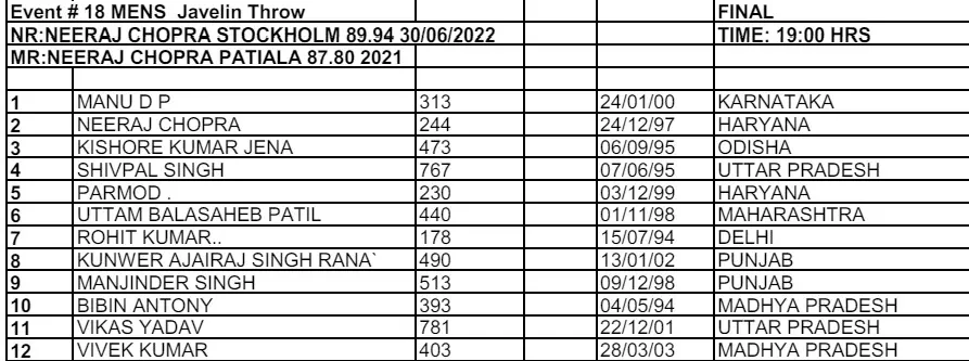 Here is the lineup of the men's javelin throw final which includes the starman Neeraj Chopra.