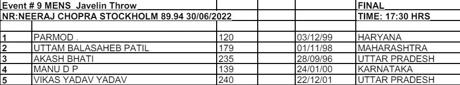 Here is the start list for the men's javelin throw, only five players are there in the competition.